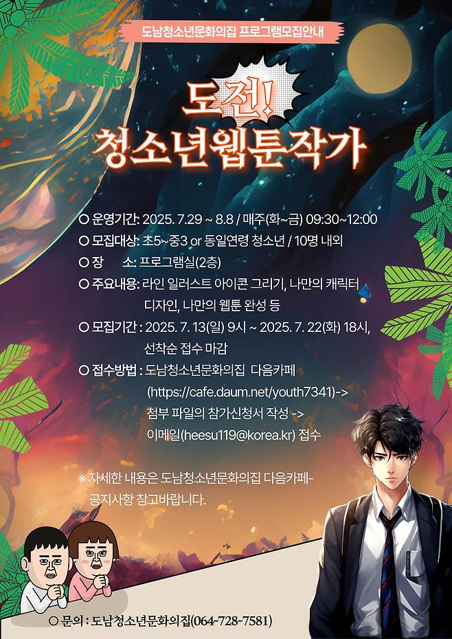 제주시가 '도전! 청소년 웹툰작가' 프로그램을 오는 29일부터 다음 달 8일까지 도남청소년문화의집에서 운영합니다.