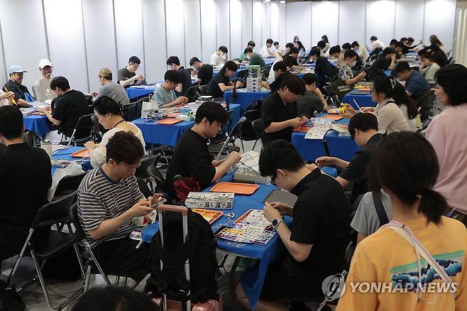 (서울=연합뉴스) 류효림 기자 = 17일 서울 강남구 삼성동 코엑스에서 열린 반다이남코코리아 펀 엑스포 2025에서 방문객들이 프라모델 조립 체험을 하고 있다. 2025.7.17