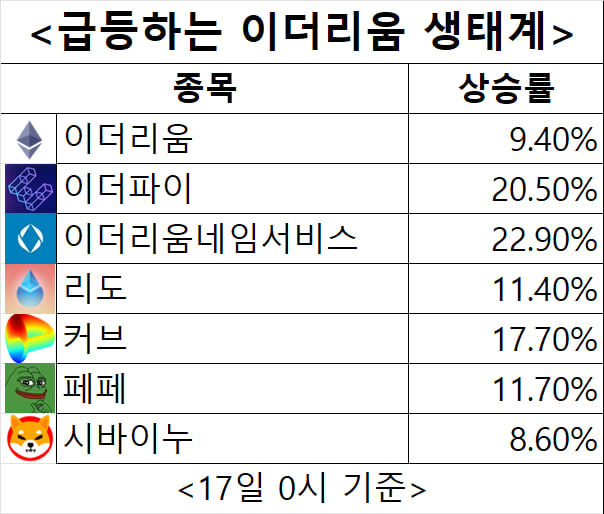 리도와 커브 등 이더리움 기반의 유명 디파이 프로젝트들도 10%대 올랐고, 이더리움 기반 밈코인 페페와 시바이누도 10% 가량 상승했다.
