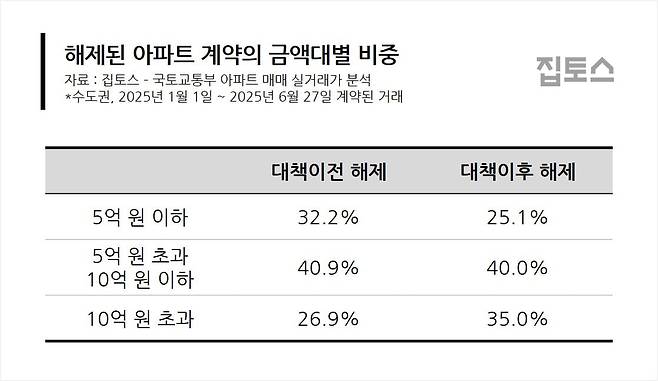 부동산 중개 플랫폼 집토스에 따르면 올해 1월 1일~6월 27일 거래된 수도권 아파트 매매 계약을 분석한 결과 대책 발표 이후(6월 27일~7월 15일) 해지한 계약 가운데 10억원 초과 아파트 비중은 35.0%로 늘었다. 대책 발표 전(1월 1일~6월 26일) 취소된 거래 중 10억원 초과 아파트 비중은 26.9%였다. 대책 발표 이후 계약 해지 비중이 8.1%포인트 증가했다.