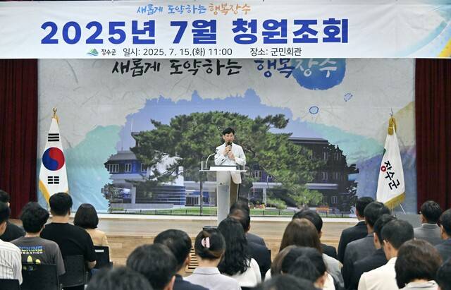 장수군이 민선 8기 출범 3주년을 맞아 그간의 군정 성과를 공유하고 향후 비전을 제시하기 위한 전 직원 청원 조회를 15일 군민회관에서 개최했다.