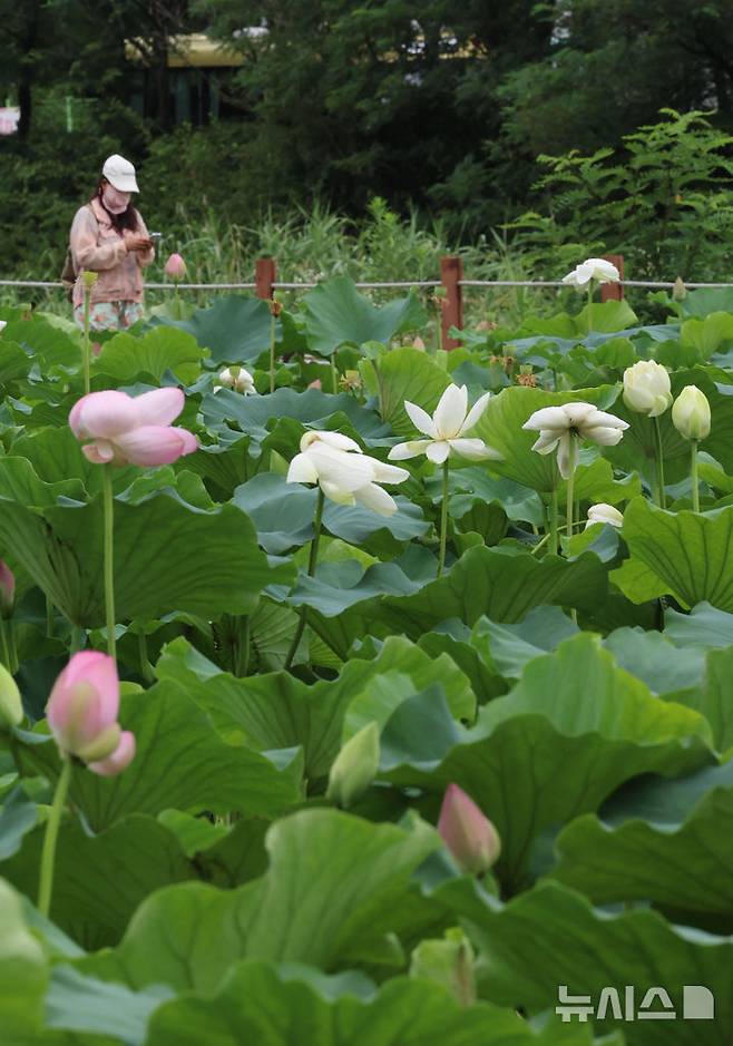 [인천=뉴시스] 전진환 기자 = 장맛비가 소강 상태를 보인 17일 오전 인천 남동구 소래습지생태공원 연꽃단지에 연꽃이 피어나고 있다. 2025.07.17. amin2@newsis.com