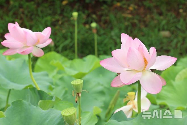 [인천=뉴시스] 전진환 기자 = 장맛비가 소강 상태를 보인 17일 오전 인천 남동구 소래습지생태공원 연꽃단지에 연꽃이 피어나고 있다. 2025.07.17. amin2@newsis.com