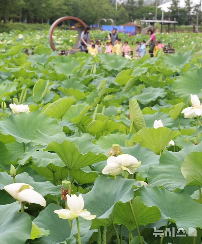 [인천=뉴시스] 전진환 기자 = 장맛비가 소강 상태를 보인 17일 오전 인천 남동구 소래습지생태공원 연꽃단지로 산책을 나온 어린이들이 연꽃을 감상하고 있다. 2025.07.17. amin2@newsis.com