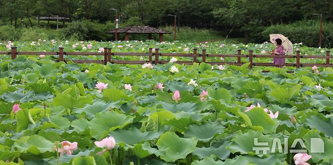 [인천=뉴시스] 전진환 기자 = 장맛비가 소강 상태를 보인 17일 오전 인천 남동구 소래습지생태공원 연꽃단지에 연꽃이 피어나고 있다. 2025.07.17. amin2@newsis.com