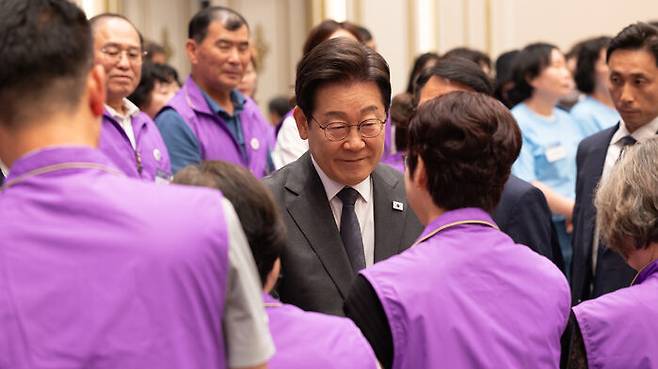 ▲ 이재명 대통령이 16일 청와대 영빈관에서 열린 '기억과 위로, 치유의 대화' 사회적 참사 유가족 간담회에서 10·29 이태원 참사 유가족과 인사하고 있다.