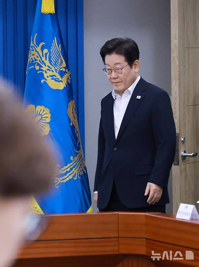 [서울=뉴시스] 최동준 기자 = 이재명 대통령이 17일 서울 용산 대통령실 청사에서 열린 4차 수석·보좌관 회의에 입장하고 있다. (대통령실통신사진기자단) 2025.07.17. photocdj@newsis.com