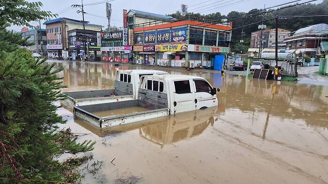 도로를 덮은 빗물은 더 낮은 곳을 찾아 주변 상가 공터로 흘러들었고, 순식간에 사람 가슴 높이까지 차오르며 공터에 주차된 1t 트럭 2대를 덮쳤습니다.
