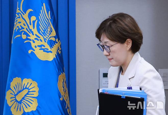 [서울=뉴시스] 최동준 기자 = 김현지 총무비서관이 17일 서울 용산 대통령실 청사에서 열린 4차 수석·보좌관 회의에 참석하고 있다. (대통령실통신사진기자단) 2025.07.17. photocdj@newsis.com