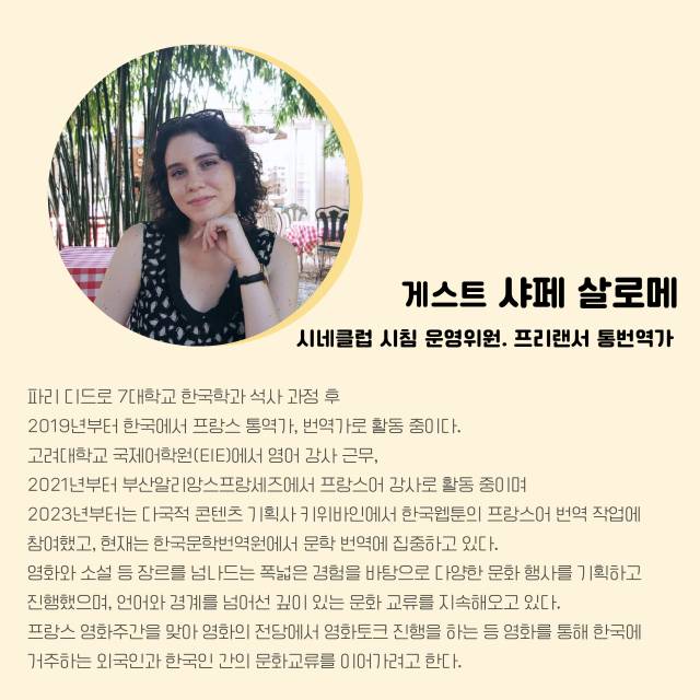 한편 부일시네마에서 영화 상영이 끝나면 서로의 감상을 공유하는 시간인 ‘커뮤니티 시네마’가 진행된다. 시네클럽 ‘시침’ 운영위원이자 통번역가인 샤페 살로메가 모더레이터로서 관객들과 소통할 예정이다.