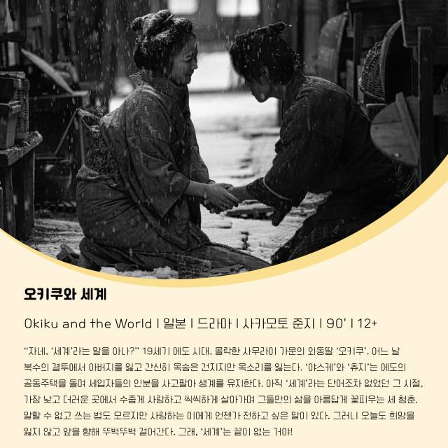 ‘오키쿠와 세계’는 메시지에만 집중하는 영화가 아니다. 세 주인공의 순진무구한 사랑이 관람 포인트다. 절에서 글을 가르치는 오키쿠는 어느 날 결투에 휘말려 아버지와 목소리를 잃고, 야스케와 츄지는 글을 쓸 줄 모른다. 이러한 결점과 계층마저 초월한 사랑은 지극히 애절하다. 귀엽고 사랑스러운 캐릭터인 오키쿠 역을 맡은 구로키 하루의 연기도 인상적이다.