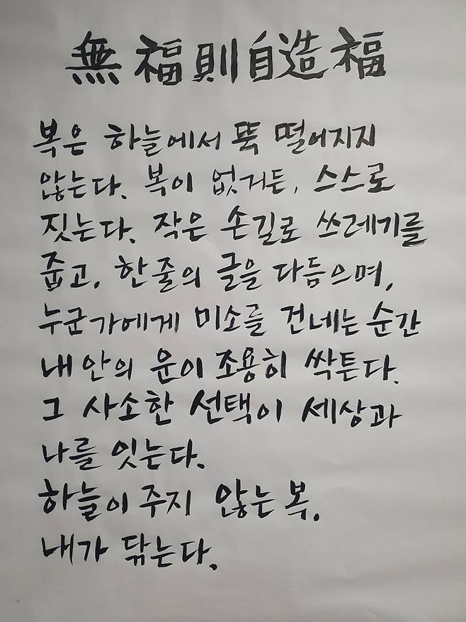 | ▲ 무복즉자조복(無福則自造福) 복은 하늘에서 뚝 떨어지지 않는다. 복이 없거든, 스스로 짓는다. 작은 손길로 쓰레기를 줍고, 한 줄의 글을 다듬으며, 누군가에게 미소를 건네는 순간 내 안의 운이 조용히 싹튼다. 그 사소한 선택이 세상과 나를 잇는다. |
