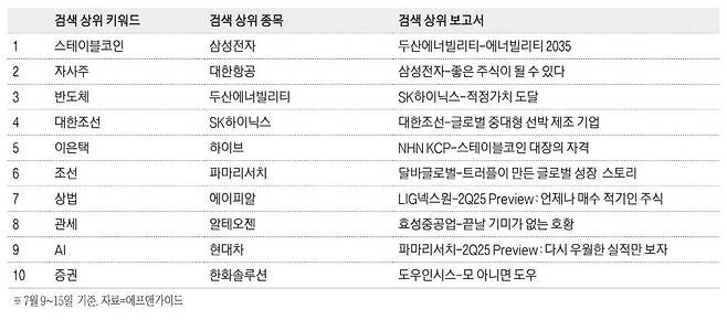 금융정보업체 에프앤가이드에 따르면 7월 9일부터 15일까지 일주일 동안 투자자들이 가장 많이 검색한 키워드는 '스테이블코인'으로 나타났다. 한국은행의 '코인런' 우려 제기와 맞물려 주가 변동성이 확대되면서 스테이블코인 관련주의 향방에 관심이 쏠린 것으로 풀이된다.