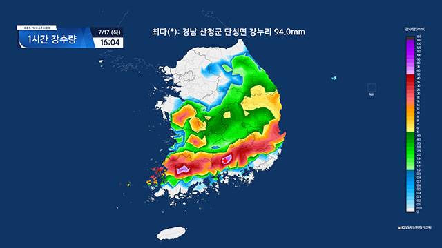 직전 1시간 동안 30mm 이상 비가 내린 집중호우 지역은 경남 산청군 단성면 강누리 94mm, 전남 나주시 금천면 오강리 71mm, 광주 남구 노대동 70mm, 경남 합천군 삼가면 두모리 70mm, 광주 서구 풍암동 59mm 등입니다.