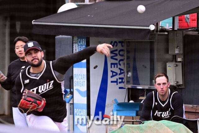 KT 새로운 외국인 투수 패트릭이 헤이수스의 투구를 보고 있다.