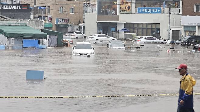 오후 2시 21분 노곡동 일대 도로가 폭우에 침수됐습니다.