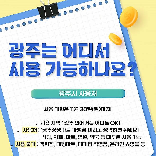 - 사용처 : ‘광주상생카드 가맹점’이라고 생각하면 쉬워요! 식당, 카페, 마트, 병원, 약국 등 대부분 사용 가능