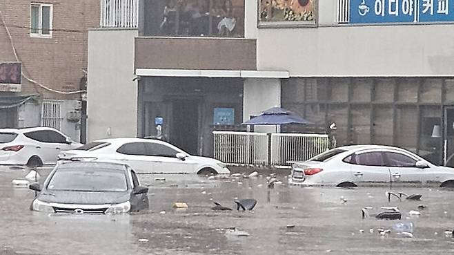 ▲ 17일 대구 북구 노곡동 일대가 폭우로 침수돼 차들이 물에 잠겨 있다.