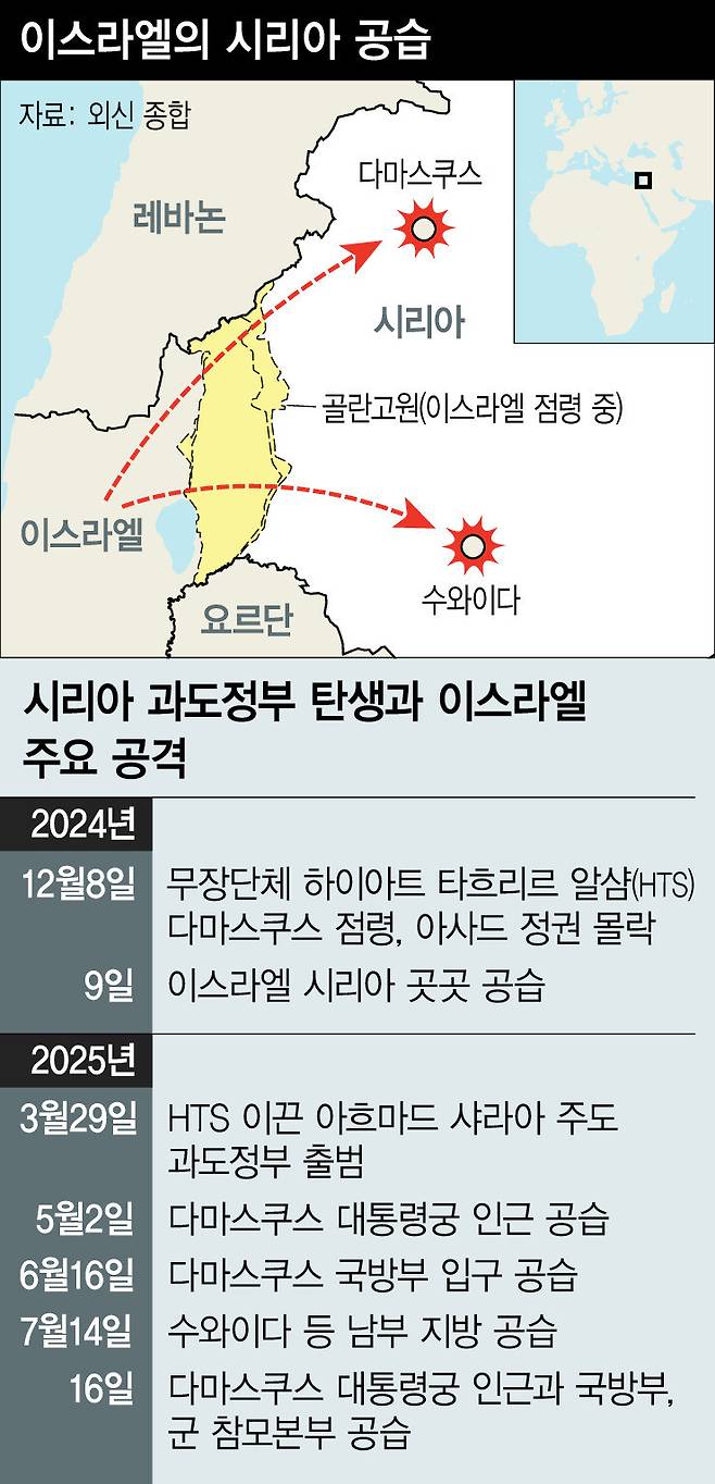 지난해 12월8일 아흐마드 샤라아가 이끄는 무장단체 ‘하이아트 타흐리르 알샴’(HTS)이 아사드 독재정권을 무너뜨린 이후 이스라엘은 드루즈족 보호를 명분으로 내걸고 지난 5월에도 대통령궁 인근을 공습한 적이 있다.