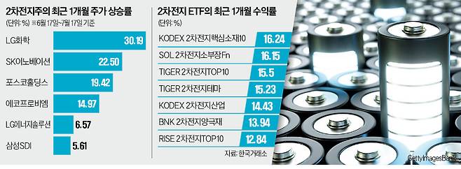 이들 ETF는 편입 종목이 급등하면서 좋은 성적을 냈다. LG화학은 지난 한 달간 30.19%, 포스코홀딩스는 19.42% 상승했다. 에코프로비엠은 14.97% 올랐다. LG에너지솔루션(6.57%) SK이노베이션(22.50%) 삼성SDI(5.61%) 등 배터리 3사 주가도 상승했다.
