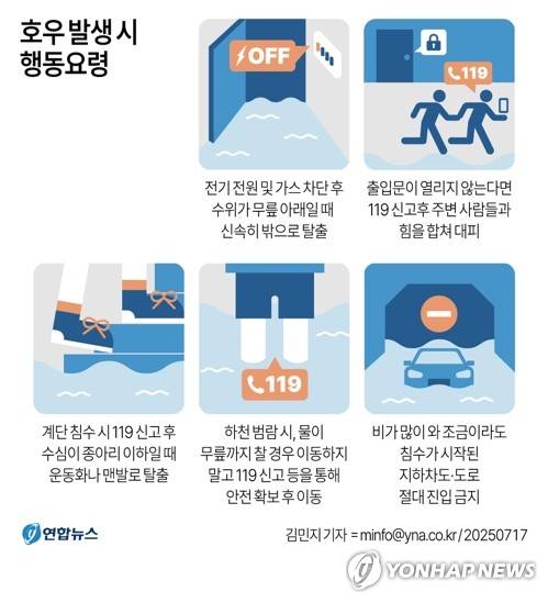 (서울=연합뉴스) 김민지 기자 = 17일 기상청과 행정안전부 등에 따르면 호우가 시작된 때에는 신속히 안전한 곳으로 대피하고, 외출을 삼가며 이웃이나 가족과의 연락을 통해 안전 여부를 확인해야 한다.