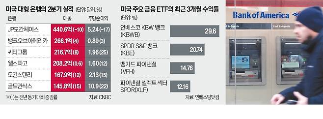 미국 금융 상장지수펀드(ETF)는 최근 은행주의 호실적 기대에 힘입어 두 자릿수 상승률을 보이고 있다. ‘인베스코 KBW 뱅크’(KBWB)는 최근 3개월 동안 29.6% 상승했다. 골드만삭스, 모건스탠리 등 미국 주요 대형 은행주를 담은 ETF로, 같은 기간 S&P500지수 상승률(18.7%)을 웃돌았다. ‘SPDR S&P 뱅크’(KBE)도 이 기간 20.74% 올랐다.