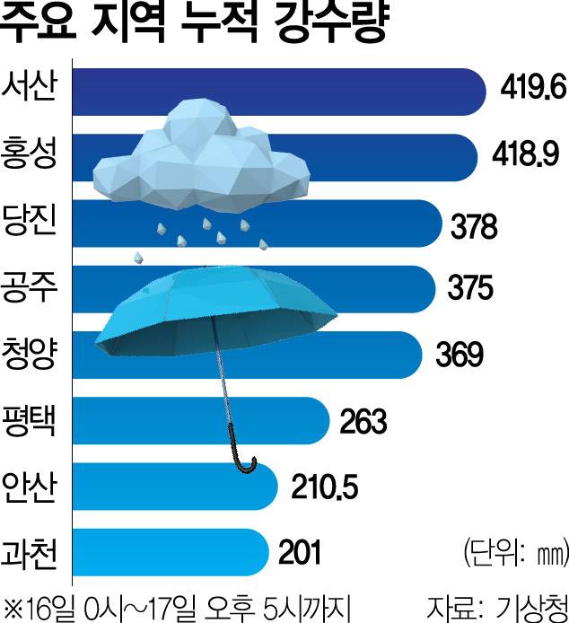 중앙재난안전대책본부에 따르면 전날인 16일 0시부터 이날 오후 5시까지 서산 419.6㎜, 홍성 418.9㎜, 당진 378㎜, 공주 375㎜, 청양 369㎜의 폭우가 쏟아졌다. 서산에는 시간당 114.9㎜의 극한호우가 쏟아졌는데 이는 100년에 1번 발생할 수 있는 강수량이라는 게 기상청의 설명이다. 평택 263.5㎜, 안산 210.5㎜, 과천 201㎜, 군포 187㎜ 등 경기 남부지역에서도 기록적인 강수량이 관측됐다.