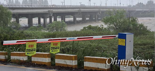 | ▲ 17일 오후 영산강 광주광역시(극락교) 지점에 홍수주의보가 내려진 가운데 광주 서구 벽진동 극락교 진입로가 통제돼 있다. |