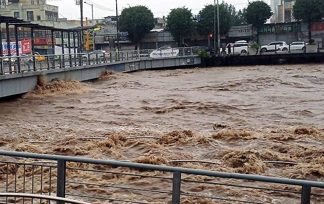 | ▲ 호우 특보가 발효된 17일 오후 광주 서구 양동 인근 광주천이 범람 위기를 맞고 있다. |