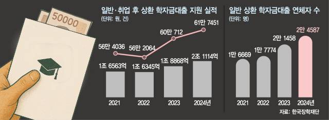 그러나 최근 3년 사이 학자금 대출액은 반등세를 보였다. 2021년 1조 6563억 원이던 학자금 대출액은 2022년 1조 6345억 원으로 감소하다 지난해부터 다시 늘어나기 시작했다. 빚을 갚지 못하는 이들도 크게 늘었다. 같은 기간 1만 6669명이던 일반 상환 학자금 대출 연체자 수는 2023년 2만 1458명으로 2만 명대를 돌파한 뒤 지난해 2만 4587명으로 전년 대비 14% 증가했다.