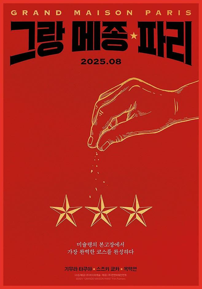 한국 개봉 소식과 함께 공개된 '그랑 메종 파리' 런칭 포스터는 강렬한 레드 톤 위에 미슐랭 3스타를 상징하는 황금빛 별 세 개가 배치돼 있다. 손끝에서 떨어지는 황금빛 가루는 셰프의 섬세한 손길로 완성되는 가장 완벽한 한 접시를 암시하고 있다.