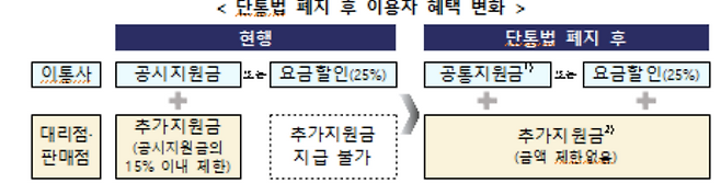 또 번호이동·신규가입 등 가입유형별 지원금과 요금제별 지원금에 대한 엄격한 차별금지 규정도 없어져 이동통신사와 유통점은 다양한 형태로 단말기 지원금 영업 경쟁을 할 수 있게 됩니다.