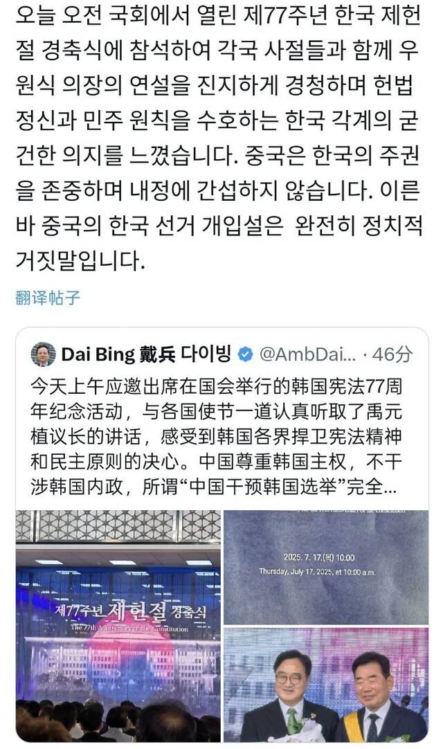 다이 대사는 이날 오후 ‘엑스’에 글을 올려 “오늘 오전 국회에서 열린 제77주년 한국 제헌절 경축식에 참석해 각국 사절들과 함께 우원식 국회의장의 연설을 진지하게 경청하며 헌법 정신과 민주 원칙을 수호하는 한국 각계의 굳건한 의지를 느꼈다”며 이렇게 말했다.
