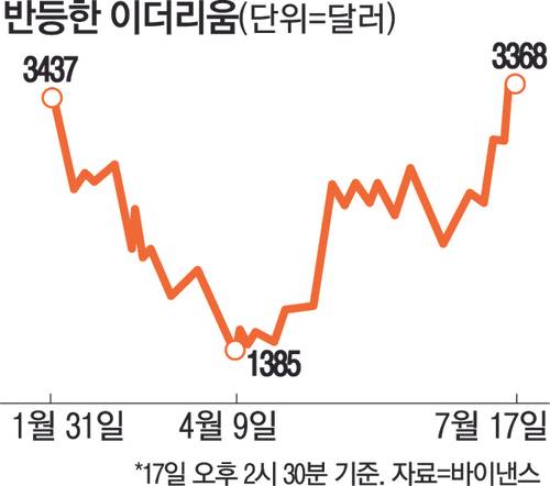17일 이더리움은 세계 최대 거래소인 바이낸스에서 이날 새벽 3425달러까지 오르며 지난 1월 31일 이후 167일 만에 3400달러선을 넘어섰다. 이후 소폭 하락해 3300달러선에 거래되고 있다.