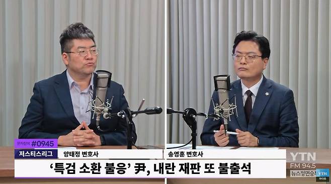 ◇ 신율 명지대 정치외교학과 교수 (이하 신율) : 신율의 뉴스 정면 승부 4부 시작하겠습니다. 오늘 4부 저스티스 리그인데요. 지금 스튜디오에 송영훈 변호사, 양태정 변호사 두 분 나와 계십니다. 어서 오십시오. 윤석열 전 대통령이 지난 10일 재판에 이어서 오늘도 내란 재판에 불출석을 했는데 윤갑근 변호사에 따르면 계단을 오르기 힘들 정도로 건강이 악화돼서 장시간 앉아 있어야 하는 재판은 힘들다. 결국 재판 불출석이 불이익으로 돌아올 수 있지만 그걸 감수할 정도로 건강이 안 좋다 이런 얘기인 모양이죠.