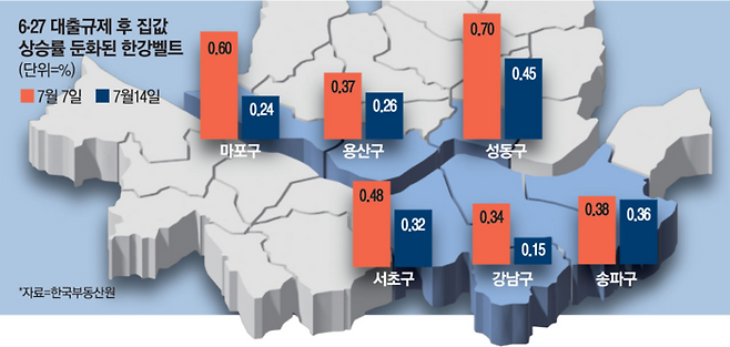 6·27 대출 규제 이후 서울 아파트값 상승률이 눈에 띄게 꺾이고 있다.