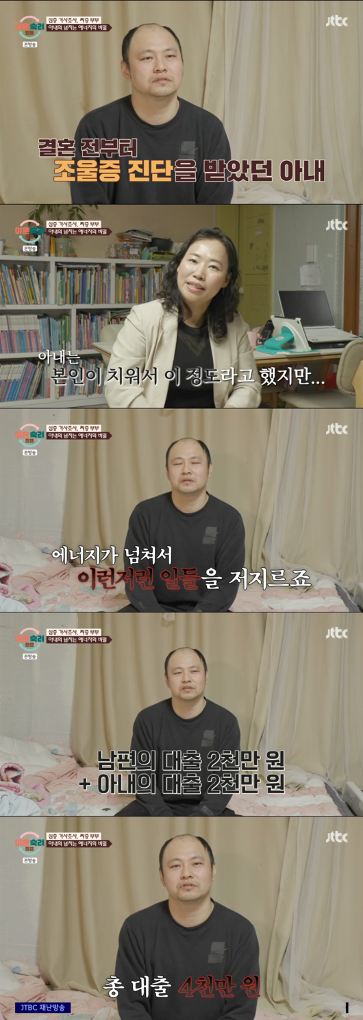 에너지 넘치는 모습은 아내의 진짜 모습이 아니라는 남편은 “에너지가 넘쳐서 이런저런 일들을 저지른다”라며 집 정리를 안하고 물건들을 죄다 꺼낸다고 설명했다. 남편은 아내가 무분별한 대출을 해서 현재 총 4천만원의 대출이 있다고 밝혔다. 아내는 빚은 있지만 불필요한 지출은 없다고 설명했다.