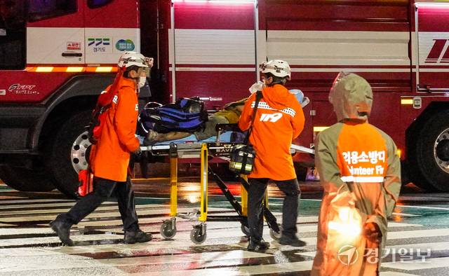 17일 오후 9시5분께 광명시 소하동 한 아파트 주차장에서 발생한 화재로 3명이 심정지 상태로 발견되는 등 모두 5명이 중상을 입는 등 인명피해가 발생했다. 소방대원들이 피해자를 병원으로 이송하고 있다.