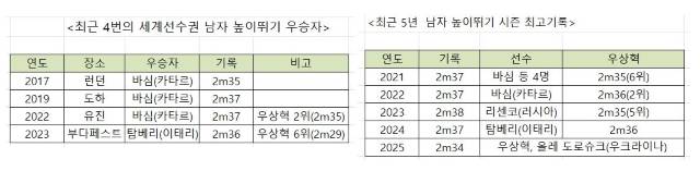 개인 최고 기록이 2m36(한국기록 2022년)인 우상혁은 이런 가파른 상승세를 바탕으로 오는 9월 일본 도쿄에서 열리는 세계육상선수권에서 사상 첫 한국의 금메달을 노릴 예정입니다(역대 최고는 2022년 자신의 은메달). 우상혁은 지난해 큰 기대를 모았던 파리 올림픽에서 7위(2m27)로 부진했는데, 언제 그랬냐는 듯 1년 만에 절정의 컨디션을 보이고 있는 것입니다.