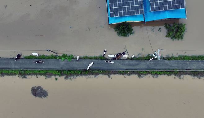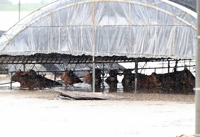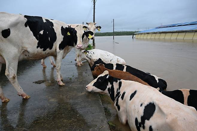 집을 잃어버려 이재민이 된 젖소들은 간신히 얼굴만 내놓고 숨을 쉬고 있었다. 축사 주인은 일단 물이 다 빠져야 뭐라도 할 수 있겠다면서 망연자실해 했다.