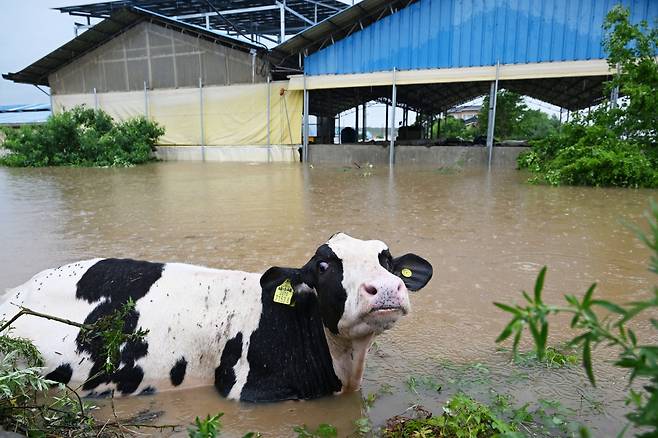 충남 전역에 집중호우가 발생한 17일 예산군 삽교읍 일대에 하천이 넘쳐 농경지와 주택이 침수됐다. 이번 침수로 인근 축사들도 물에 잠겨 갈 곳을 잃은 젖소들도 있었다. 송아지 한 마리가 연신 살려달라는 듯 슬픈 울음 소리를 냈다.