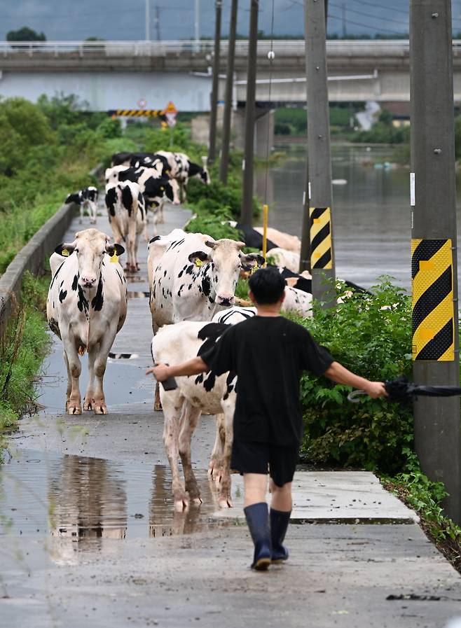 이어 젖소들이 무리지어 다른 곳으로 이동하려 하자 주인이 막아서기도 했다. 이곳에선 농장 주인들마저 급격히 불어난 물에 미쳐 대피하지 못해 119 구조대가 구조하기도 했다.
