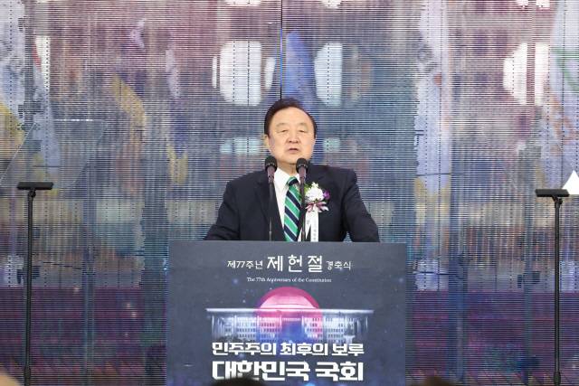 정대철 헌정회장은 17일 국회 중앙홀에서 열린 제77주년 제헌절 경축식 기념사를 통해 이들 이슈를 띄웠다.