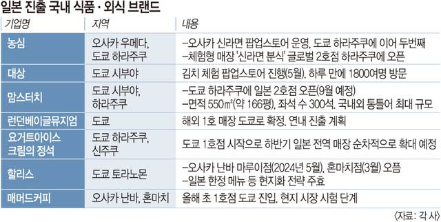 K푸드 간판도 속속 내걸리고 있다. 맘스터치는 오는 9월 도쿄 하라주쿠에 300석 규모의 일본 2호점을 열고 현지 치킨·버거 시장 공략에 나선다. 국내외 통틀어 최대 규모의 매장이다. 디저트 브랜드 ‘요거트아이스크림의정석’(요아정)은 최근 일본 도쿄의 중심 상권인 하라주쿠 다케시타 거리와 신오쿠보에 매장을 동시 출점했다. 할리스는 오사카 난바·혼마치점에 일본 한정 메뉴를 선보이며 일본 MZ세대를 겨냥하고 있다.