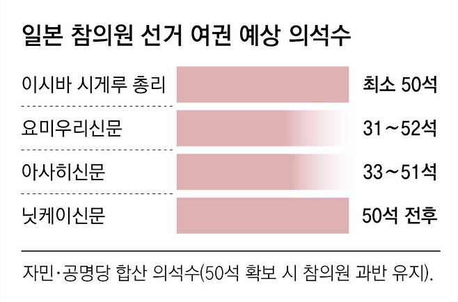 일본 참의원 의원 수는 248명으로, 임기는 6년이다. 3년 간격으로 전체 의석의 절반씩을 뽑는다. 이번 선거는 결원 1명을 포함해 지역구 75명, 비례대표 50명 등 총 125명을 뽑는다. 자민·공명 연립여당은 이번 선거에서 50석 이상을 확보해 기존 의석(75석)과 합해 과반(125석)을 유지하겠다는 목표를 세웠다. 당초 자민당 내에선 “목표를 너무 낮게 잡은 게 아니냐”는 비판도 있었지만, 선거일이 다가올수록 이 목표조차 달성하기 어렵다는 비관론이 커지고 있다.