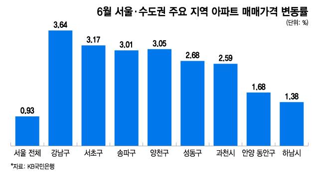 KB국민은행이 최근 발표한 7월 '주택시장 리뷰' 자료에 따르면, 지난 6월 전국 주택 매매가격은 전월 대비 0.14% 올랐다. 서울은 무려 0.93% 상승했다. 특히 강남3구(강남 3.64%, 서초 3.17%, 송파 3.01%)의 급등과 함께 양천구(3.05%), 성동구(2.68%) 등 비규제지역까지 가격 오름세가 확대됐다. 서울과 수도권 아파트는 연이은 신고가 거래와 함께 투자수요 집중 현상이 두드러진 모습이다.