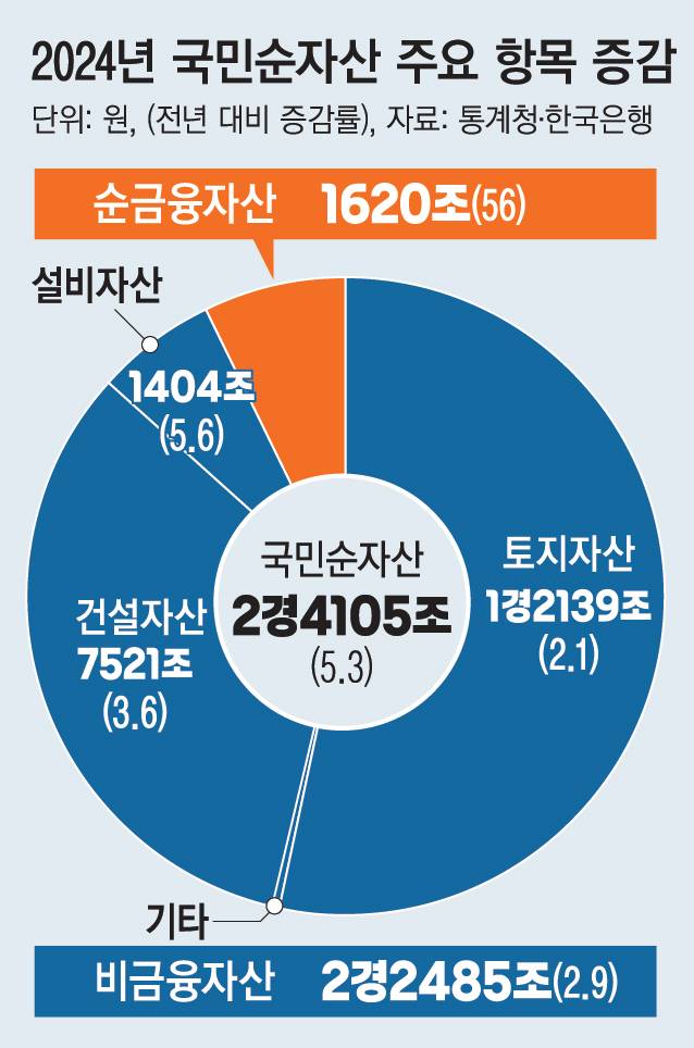 한국은행·통계청이 17일 발표한 2024년 국민대차대조표(잠정) 통계를 보면, 정부·영리법인을 뺀 가계·비영리단체의 순자산(1경3068조원)은 전년보다 3.4% 늘었다. 1년 전(1.8%)보다 증가폭이 2배가량 늘어난 것이다.
