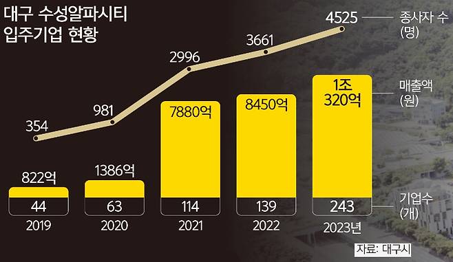 그 중심에는 한때 포도밭이었던 수성구 대흥동 일원인 수성알파시티(17만8000㎡)가 있다. 이곳은 현재 소프트웨어, 정보통신기술 관련 기업 240여개사, 4500여명이 일하는 비수도권 최대 디지털 집적단지다. 지역에서는 ‘제2의 판교밸리’로도 불린다. 가시적인 성과도 나타나고 있다. 2019년 354명이었던 수성알파시티 내 종사자 수는 2023년 4525명으로 1178% 증가했다. 같은 기간 입주 기업당 평균 고용인원은 2019년 8명에서 2023년 18명으로 늘었고, 입주 기업 총매출은 822억원에서 1조320억원으로 급성장했다.