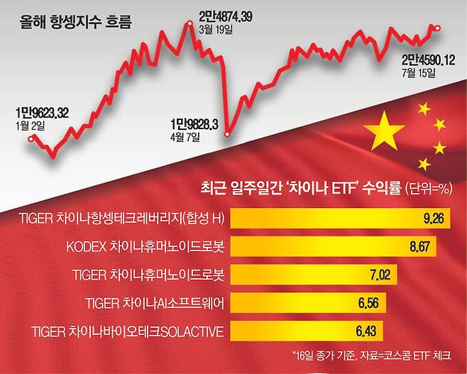 코스콤 ETF 체크에 따르면, 최근 일주일(16일 종가 기준)간 ETF 수익률 10위권 펀드 중 5개가 중국 관련 상품이었다. 이 기간 2위에 오른 ‘TIGER 차이나항셍테크레버리지(합성 H)’는 9.26%의 수익률을 기록했다.