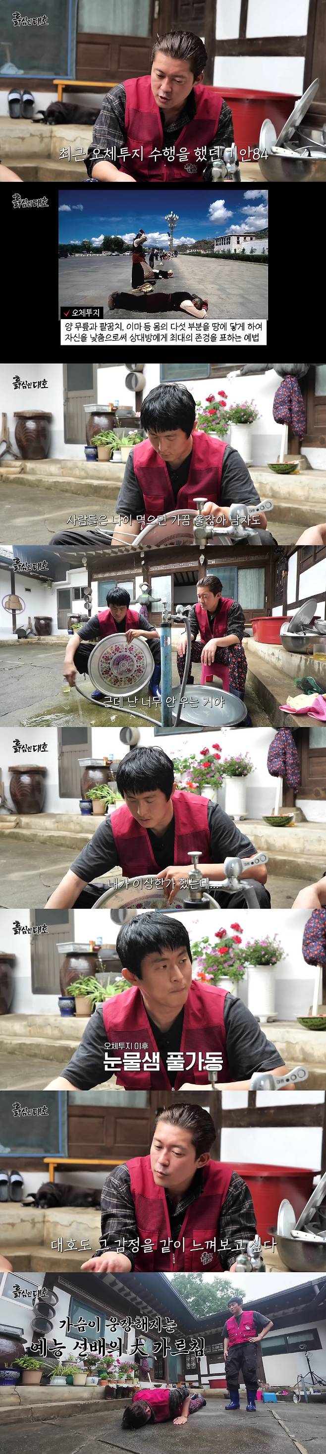 이에 김대호는 "그래서 나도 한 번 해보고 싶다는 거다. 우리 클로징을 오체투지로 하자"고 제안했고, 기안84는 즉석에서 오체투지 자세를 전수했다.